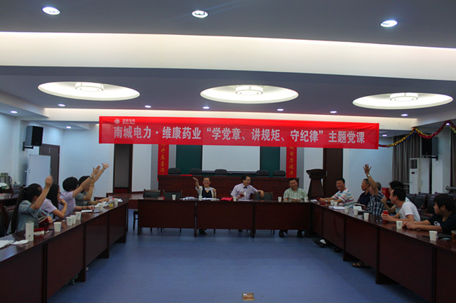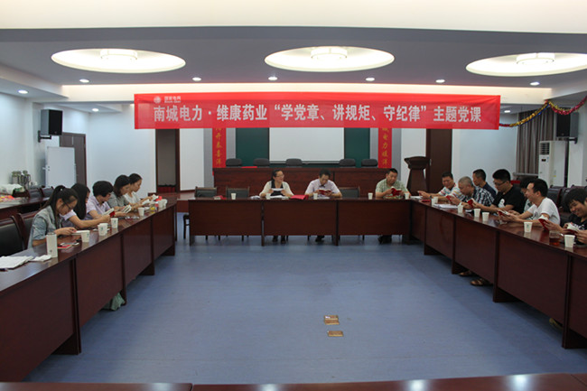 2015年7月10日下午,南城电力·hth体育网党支部活动“学党章、讲规矩、守纪律”主题党课在南城电力三楼会议室举行。此次活动是继6月举行的党建助企结对共建签约仪式后开展的第二次专题活动,南城电力分局局长黄继勇、党支部副书记沈美红、hth体育网总经理、党支部书记刘根才及双方党支部全体党员、预备党员及入党积极分子参加活动。活动由南城电力党支部副书记沈美红主持。