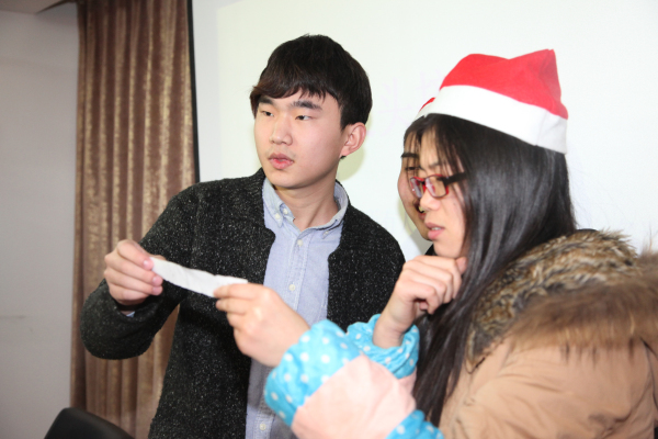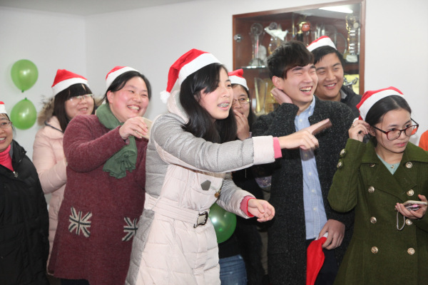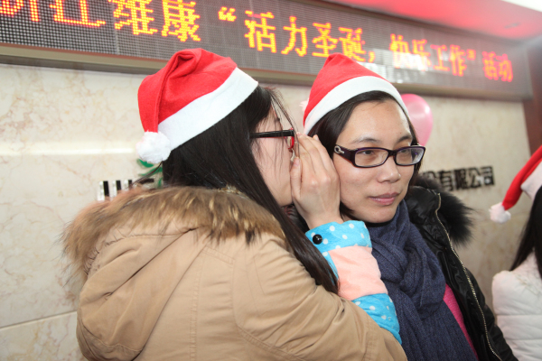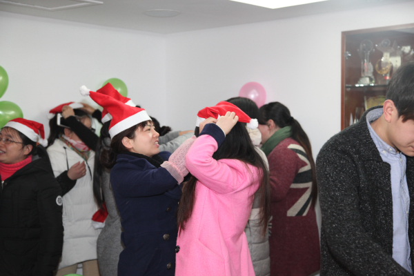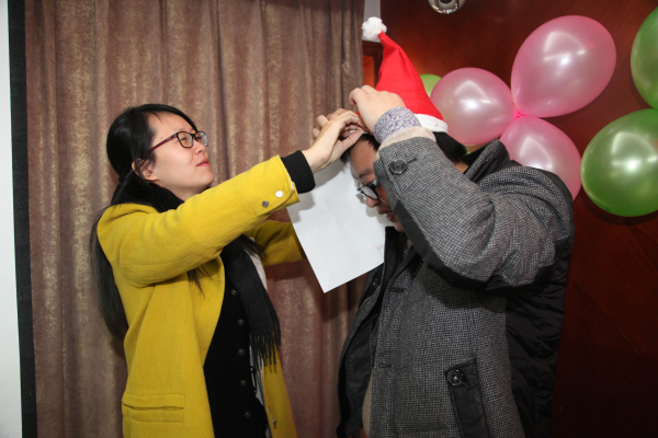 公司副总经理孔晓霞向员工表示节日夫人问候,随后送“福”活动敲响了活动的钟声,参与活动的员工每人拿一顶火红的圣诞帽为另一位同事戴上并送上真挚的祝福,温暖涌满心头。第一个游戏名曰“心有灵犀”,活动中两人一组,一人表演一人猜词。参赛者们纷纷使出浑身解数,有的巧用语言提示,有的则手舞足蹈地比划起来。场面十分有趣,而一旁的看客们也揣着一颗激动的心观战,人群中不时爆发出一阵阵笑声和掌声。最终,信息部的男女搭档以猜对11个的好成绩遥遥领先其他组,毫不费力地获得了第一名,其他参赛者也领取了精美礼品。在猜数字游戏中,所有员工围成一个圈,循环着猜了起来,活动现场洋溢着幸福的笑声。“交头接耳”游戏考验的就是组员之间的默契与信息传递的质量和效率,游戏共有两组员工参赛,每一组的第一人看过纸条上的内容,并将它通过说“悄悄话”的方式传递给下一位组员,这一过程中信息的准确性就发生了变化,最后,商务部的女生们以还原了一半原文的成绩获得了胜利。“同生共死”与“人生百味”这两个游戏也充满了趣味性,抽“命运签”、尝“百味”和猜“百味”,都牢牢吸引着大家的注意力,现场一下子安静下来,等待着结果。最后,本次活动在员工们享受了一个多小时的美食和游戏之后拉上了帷幕。