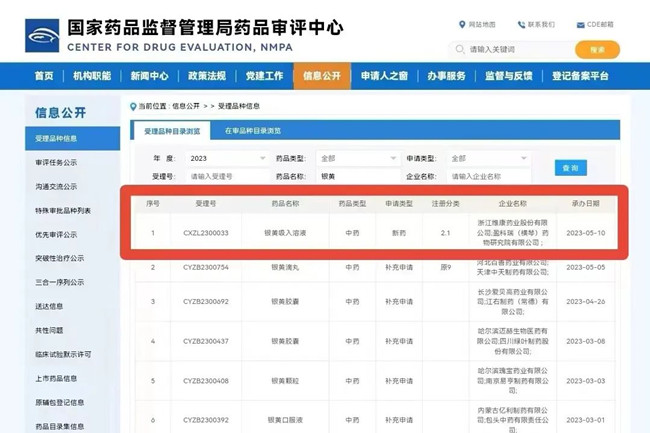 2023年5月10日,www.hth.com申报2.1类中药新药银黄吸入溶液取得国家药品监督管理局发出的《受理通知书》。申请人为www.hth.com与盈科瑞(横琴)药物研究院有限公司。