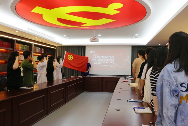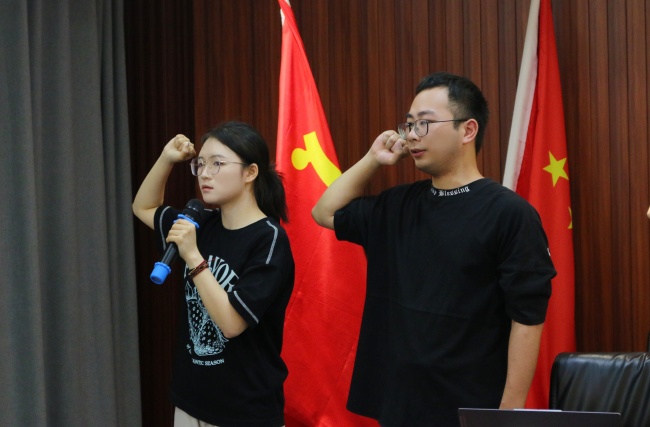 新老团支部书记交接环节,团支部书记吴漾庄严接过团旗,并带领全体团员重温入团誓词。“我志愿加入中国共产主义青年团,坚决拥护中国共产党的领导,遵守团的章程,执行团的决议,履行团员义务,严守团的纪律……”