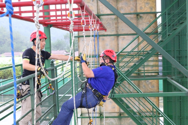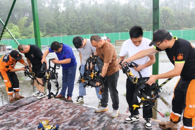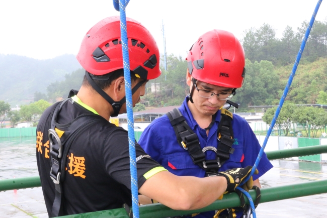 12日下午,全体参赛选手在丽水市企业互助救援联合会训练基地集结,丽水市企业互助救援联合会秘书长周磊教授了绳索救援技能,精险刺激的比拼拉开序幕!赛场上,选手们穿上绳索救援服,登上楼梯,系上牛尾,翻越栏杆,蓄势待发。“3,2,1,比赛开始”!只见选手们迅速地滑下绳索,不畏艰险,不甘示弱,均以最快的速度完成了比赛。