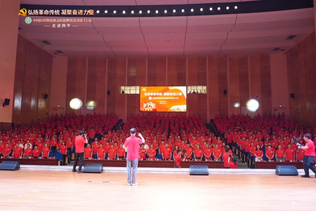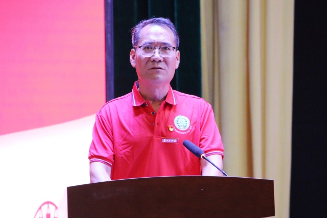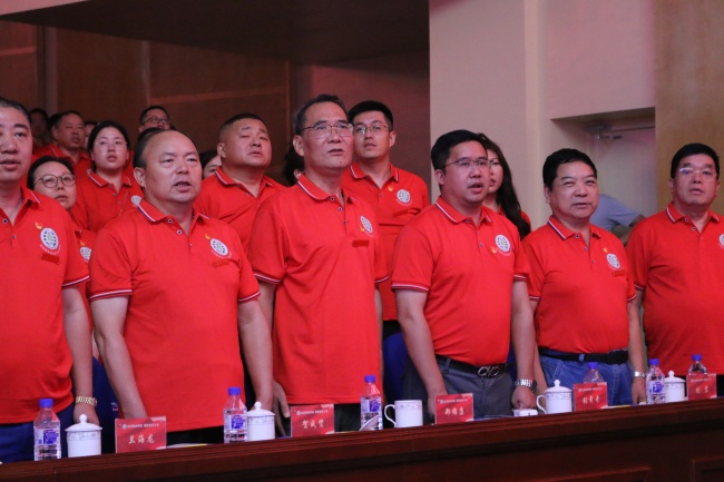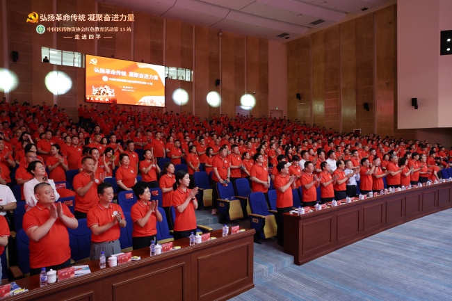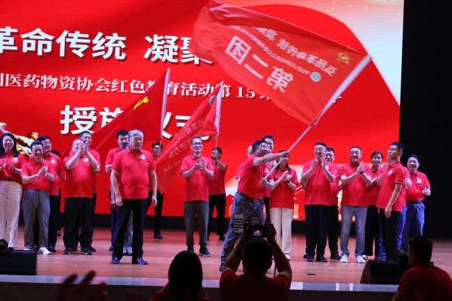 授旗仪式庄严举行。hth体育网所在的红二团团长张章奇(公司党委书记)从中国医药物资协会常务副会长李文杰手中郑重接过团旗。旗帜挥舞,士气高昂。由胡宏伟将军领唱,在激昂澎湃的《长江之歌》合唱声中,活动正式拉开序幕。